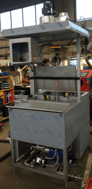 Juni 2024: Leverans av kombinerad dopp och spoltvättsmaskin till kund i Tyskland. Maskinen tvättar komplicerade rörkonstruktioner in och utvändigt. Maskinen arbeter med uppvärmd starkt alkalisk vätska och spolar godset invändigt med en membranpump sammtidigt som det doppas upp och ned ur badet.